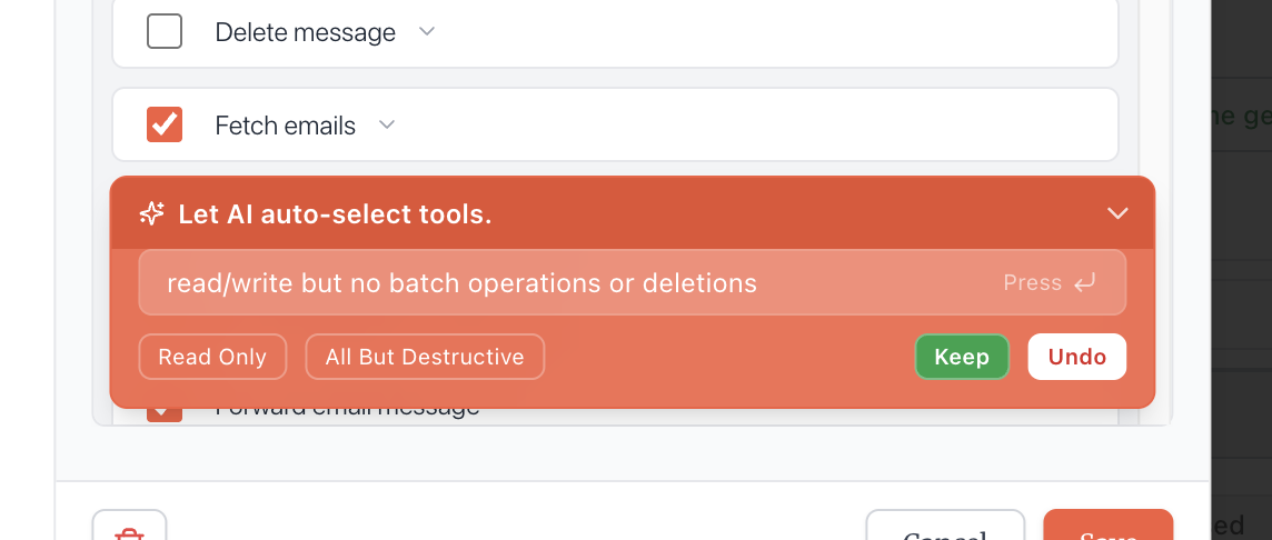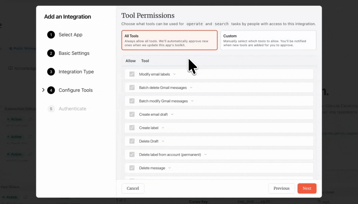 When adding or editing an integration’s tools, if you’re in custom mode, you can simply type what types of tools you want to allow and our wizard will filter the tools for you.