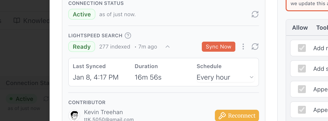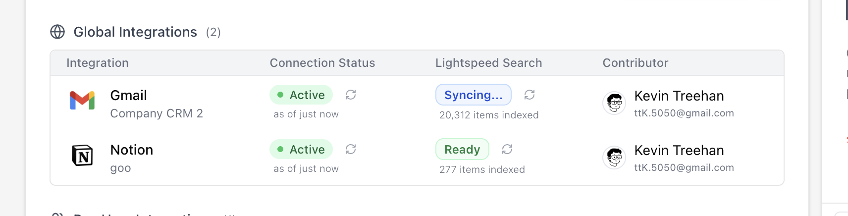 Workspace members can view all integrations and their connection status and Lightspeed Search status (if applicable) at-a-glance in workspace settings. Adjustments to tool permissions and other settings can be made by clicking on the integration. You can delete an integration at any time — this will revoke access and remove it from the workspace. If you need to reconnect an integration (for example, if credentials expired), click on the integration and press reconnect.
