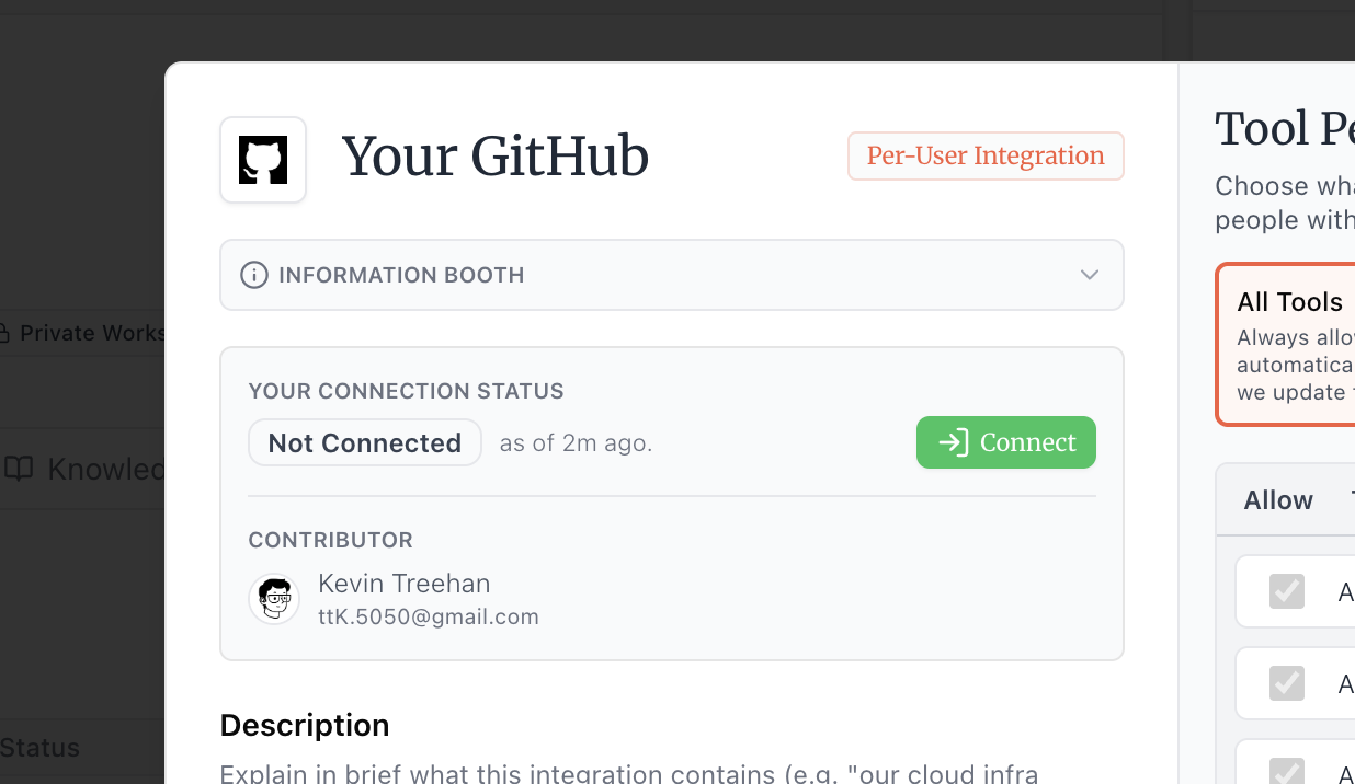 Workspace owners can add integrations from the workspace settings page. After selecting an integration and choosing global or per-user, you’ll configure which tools to expose and authenticate via OAuth.Tool Permissions