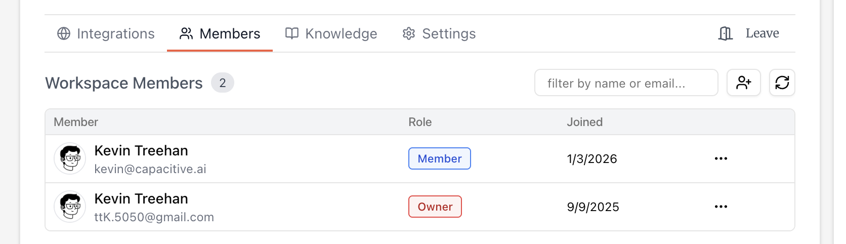 Workspace owners can invite other organization members to their workspace and assign them roles (Owner or Member). See the User Types page for details on what each workspace role can do. To leave a workspace, press leave.