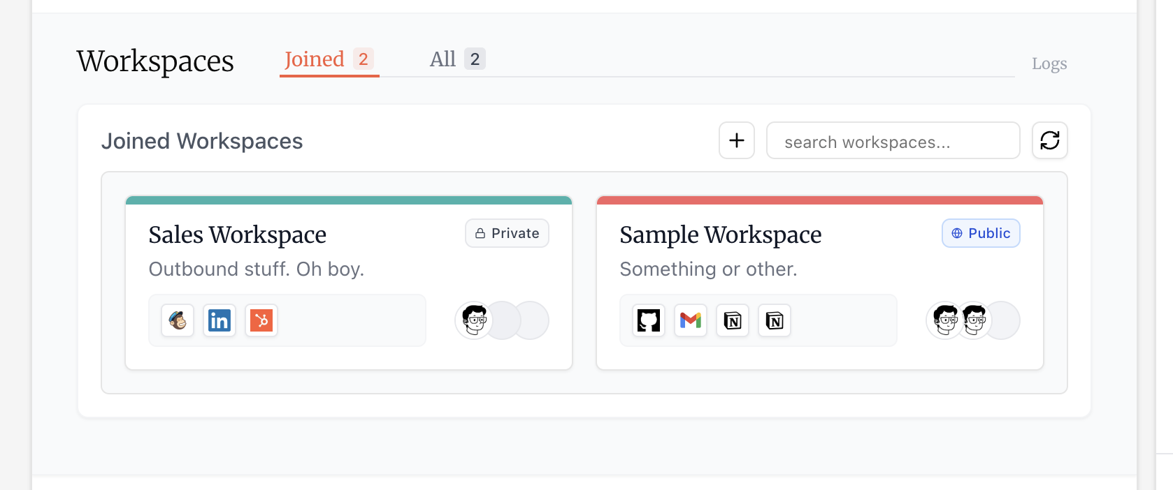 Skip to main contentWorkspaces are containers for integrations organized by use case or team. A “Sales” workspace might hold HubSpot, Gmail, and Salesforce. A “Support” workspace might contain Zendesk, Slack, and your helpdesk tools.
